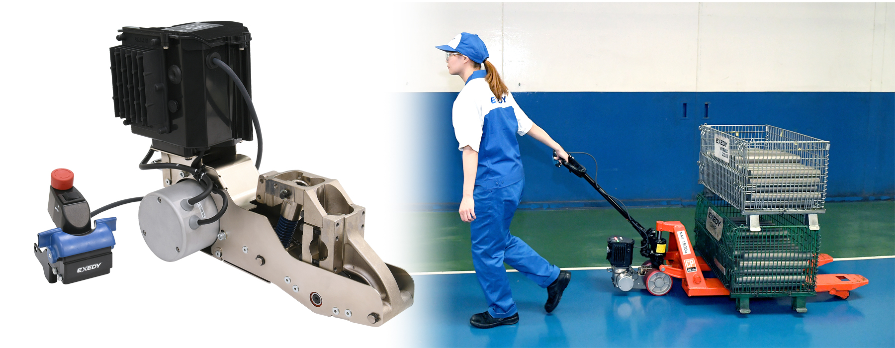 運搬作業における作業者の負担軽減や安全安心のために、駆動・電動化技術を活かして開発した、汎用性の高い電動駆動ユニットです。パレットトラック等の低速モビリティに後付けが可能で、重量物の運搬をアシストします。